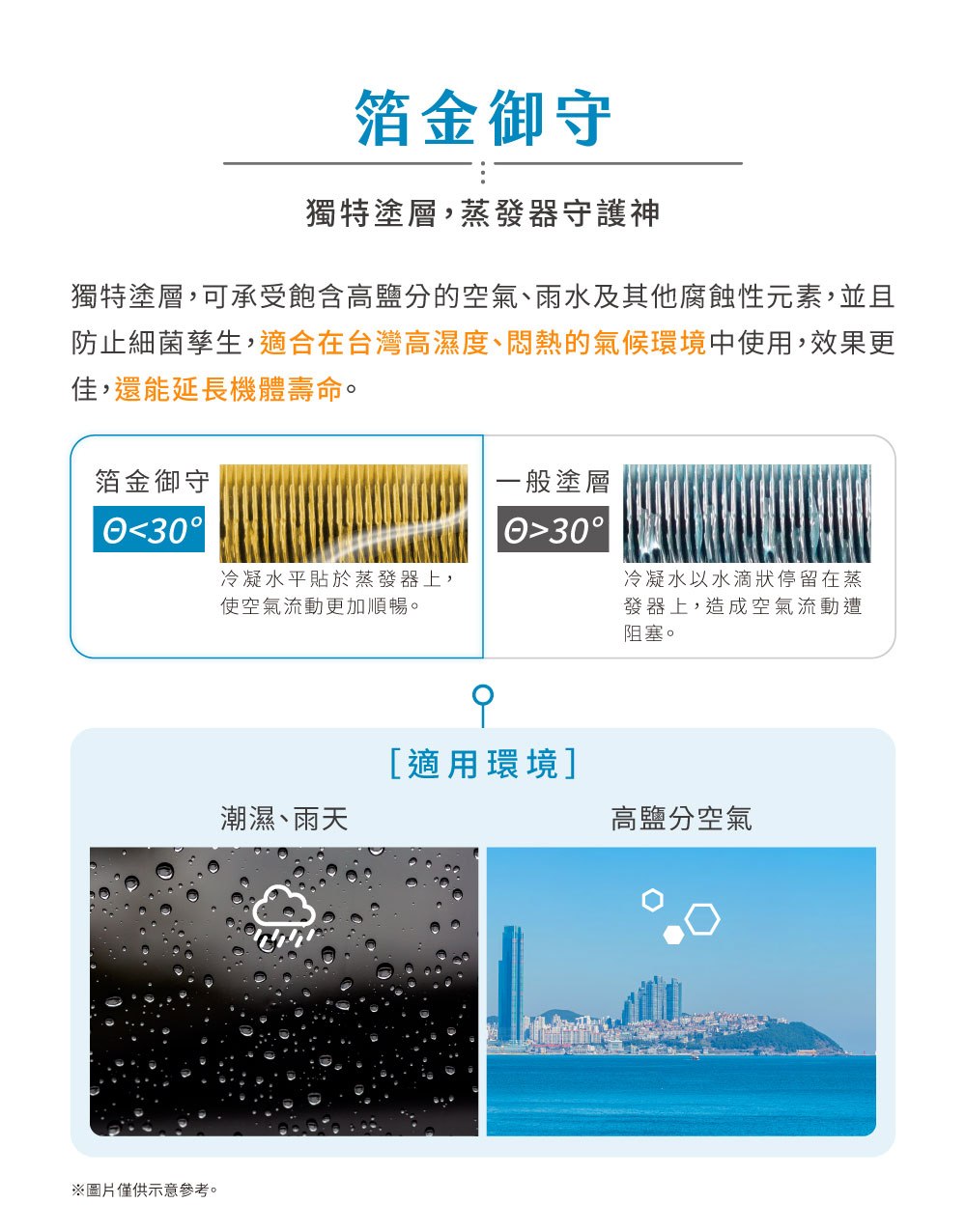 箔金御守|銀離子濾網|雙向除塵|四驅風動|隨身感溫|獨立除濕|定時開關|內外機自體清潔|銅管守護|隨心風動|舒風感|底盤支撐|智能IoT(可選配)|淨抑菌(可選配)